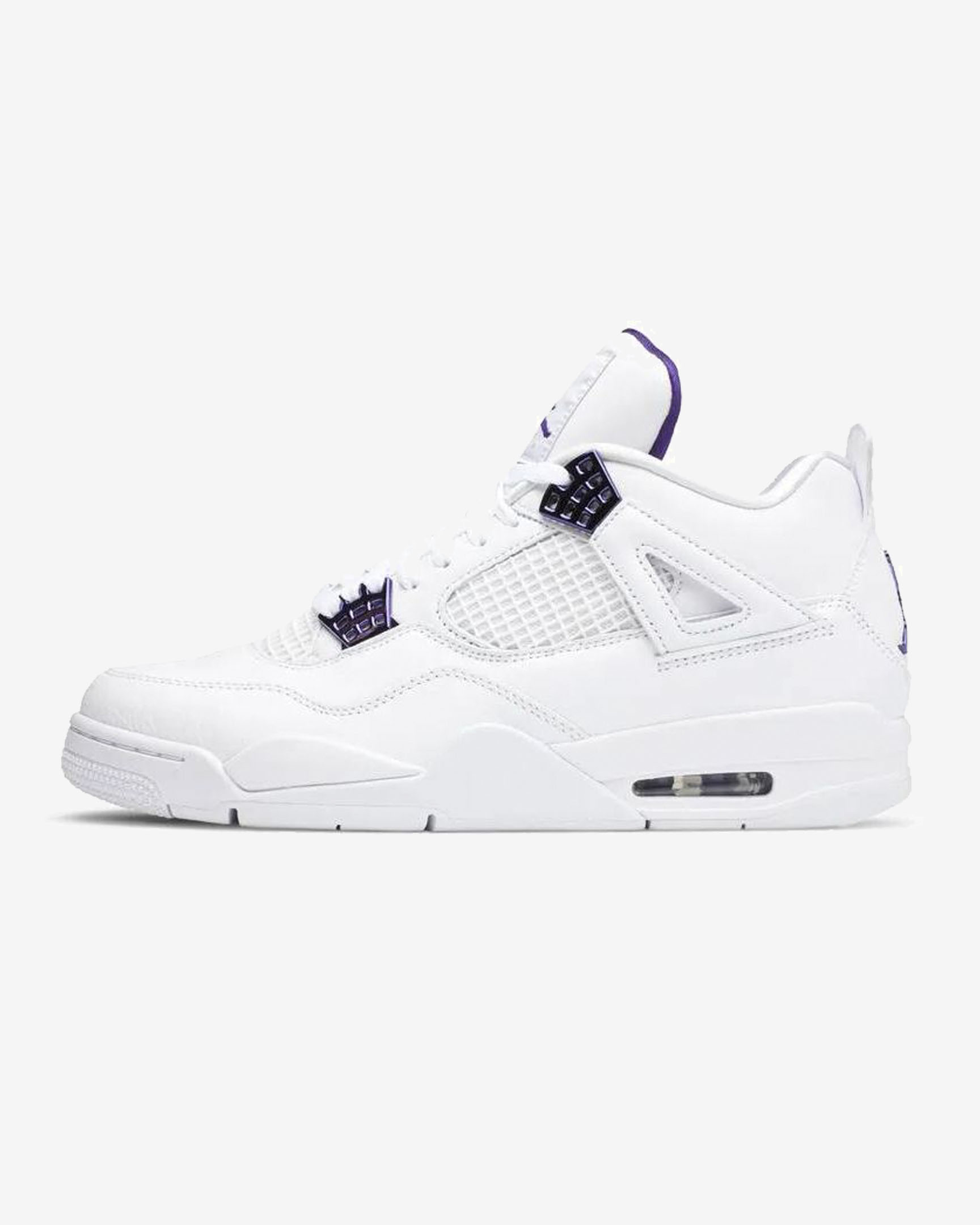 Launching as part of a four-piece Metallic Pack . the Air 4 Retro 閳ユザurple Metallic閳?showcases a simple two-tone color scheme on the classic mid-top silhouette. The sneaker utilizes a pristine white leather build . accented with violet pops of contrasting color on the molded eyelets . visible Air sole unit and exterior branding hits . including signature Jumpman logos at the woven tongue tag and heel panel.