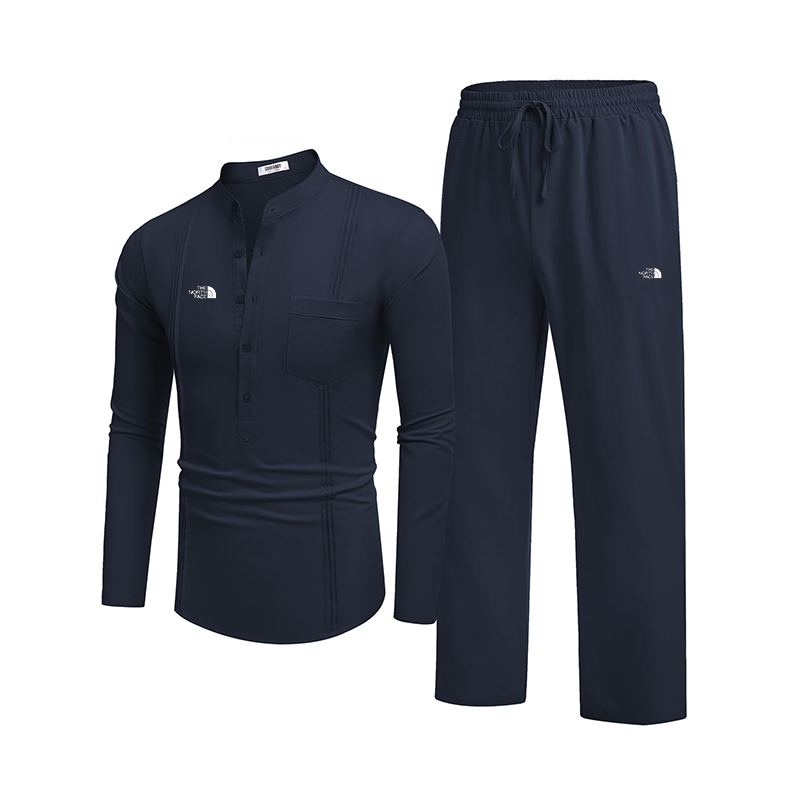 The Nothtrth Face Men's 2 Piece Cotton Linen Suit Casual Long Sleeve Henley Yoga Pants Suit Beach Cuban Outfit