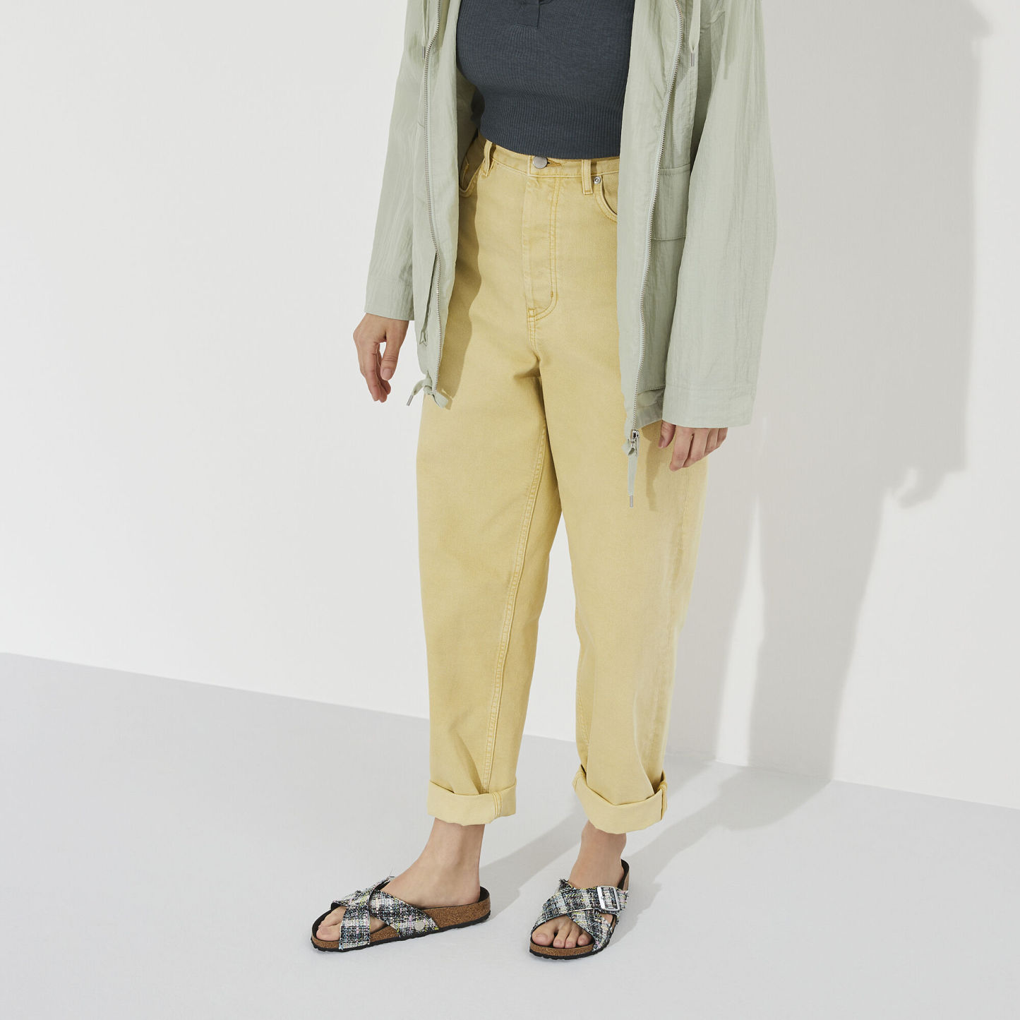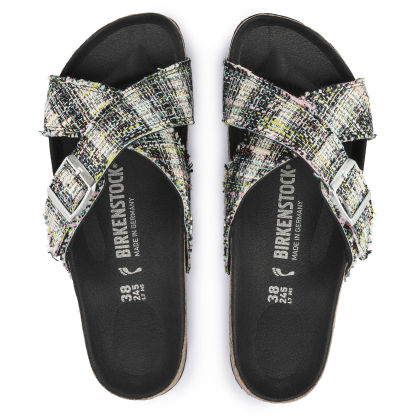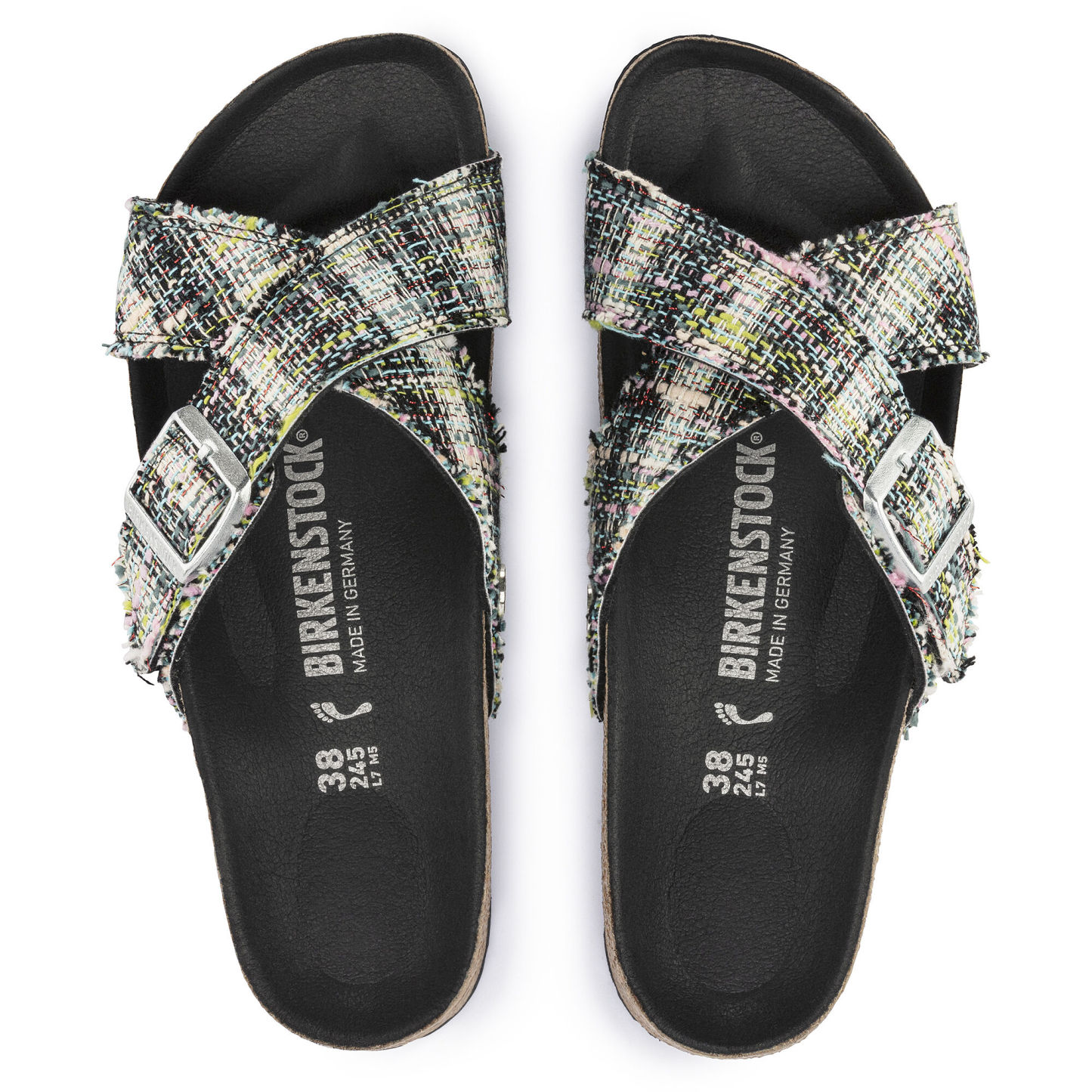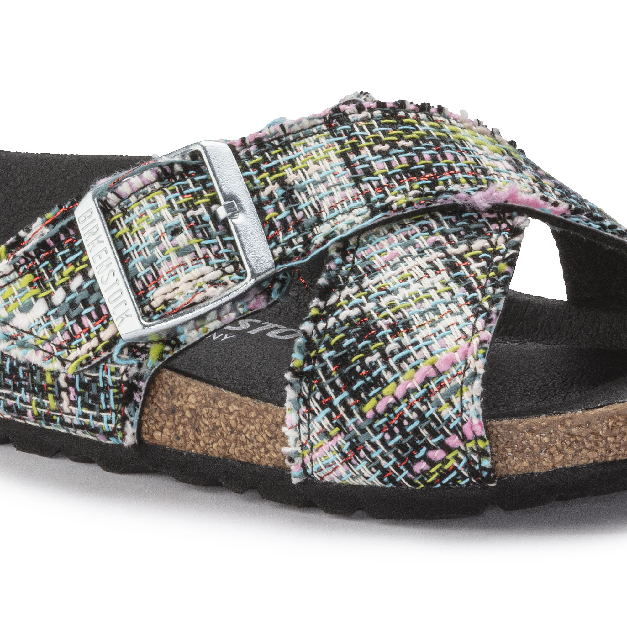 The Siena's crossover straps work unexpected color into a new woven look. Inspired by tweed, soft pastels create a weave that's perfect for the season��and 100% vegan. A smooth black microfiber footbed lining softens the feel from the inside, matching back to the sole to complete the premium look . It's finished with classic BIRKENSTOCK design elements, like a contoured cork-latex footbed that shapes to you with wear.